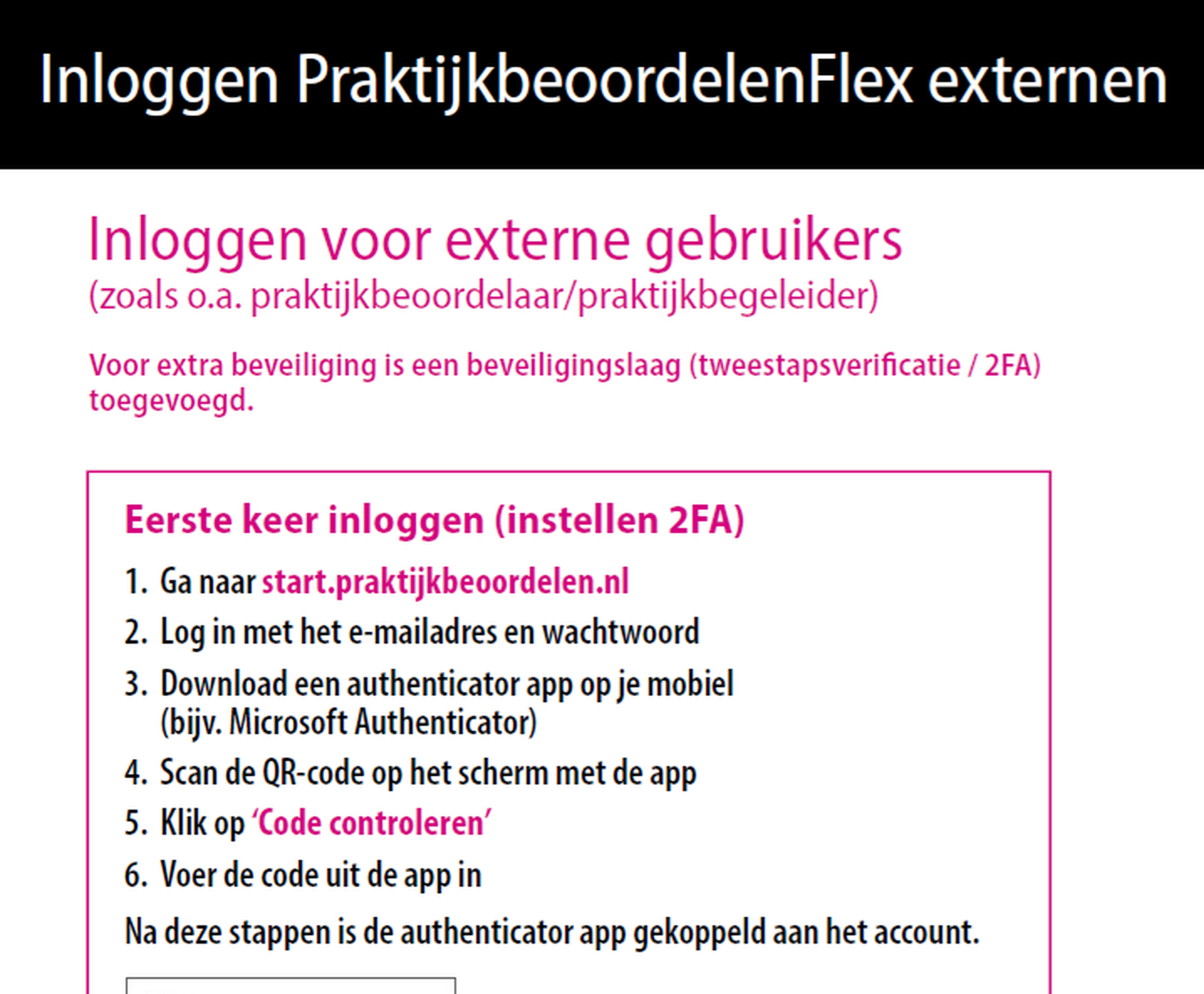 Nieuw vanaf 30 maart: bij het activeren van het account moet de gebruiker ook 2-staps verificatie (2FA) instellen met een authenticator-app. Hiervoor is een korte handleiding beschikbaar die je hier kunt downloaden. We vragen je deze handleiding mee te sturen naar externe gebruikers die je uitnodigt.